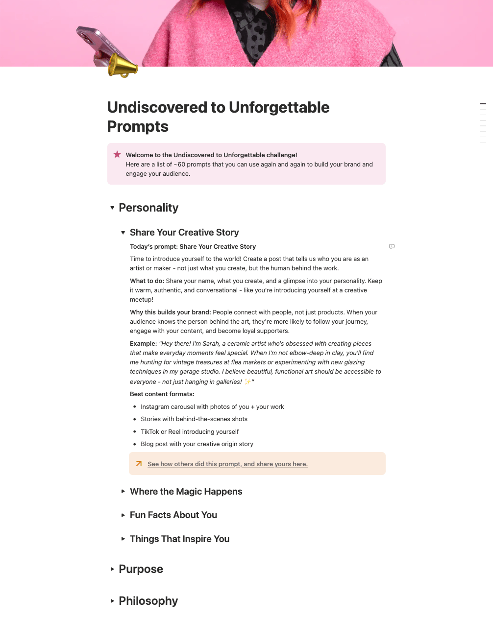 I've strategically designed 60+ content prompts around the 7 pillars that turn undiscovered creatives into unforgettable brands: Personality, Purpose, Philosophy, People, Positioning, Presentation, and Products!